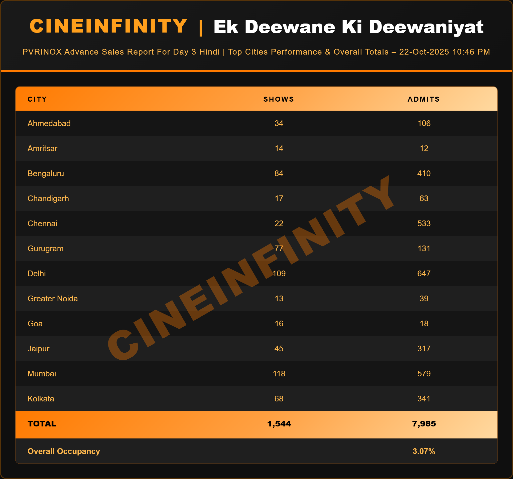 According to the latest figures, Ek Deewane Ki Deewaniyat is performing best in Delhi–NCR, Mumbai, Bengaluru, and Chennai circuits. Among these, Delhi (647 admits) and Chennai (533 admits) remain the strongest contributors in terms of occupancy, while Mumbai (579) and Bengaluru (410) follow closely behind.