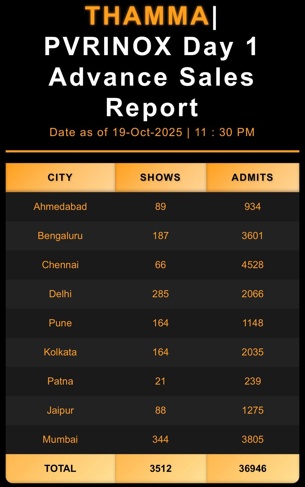 With less than 36 hours remaining for the grand Diwali release, THAMMA has posted a good yet steady advance bookings in the National Chains PVR INOX. The film has sold 36,946 tickets across 3,512 shows, reflecting strong interest in key metro markets.
