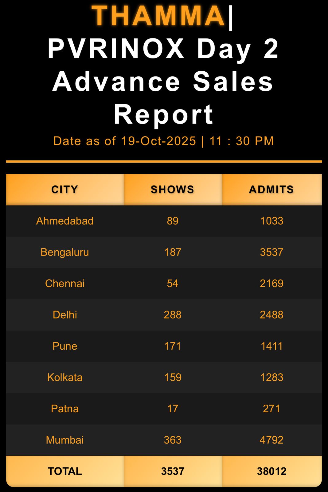 THAMMA continues its strong pre-release momentum as the Diwali excitement builds. On Day 2, the film has recorded 48,000 advance tickets across major national chains, maintaining a healthy trend in key urban and metro markets.