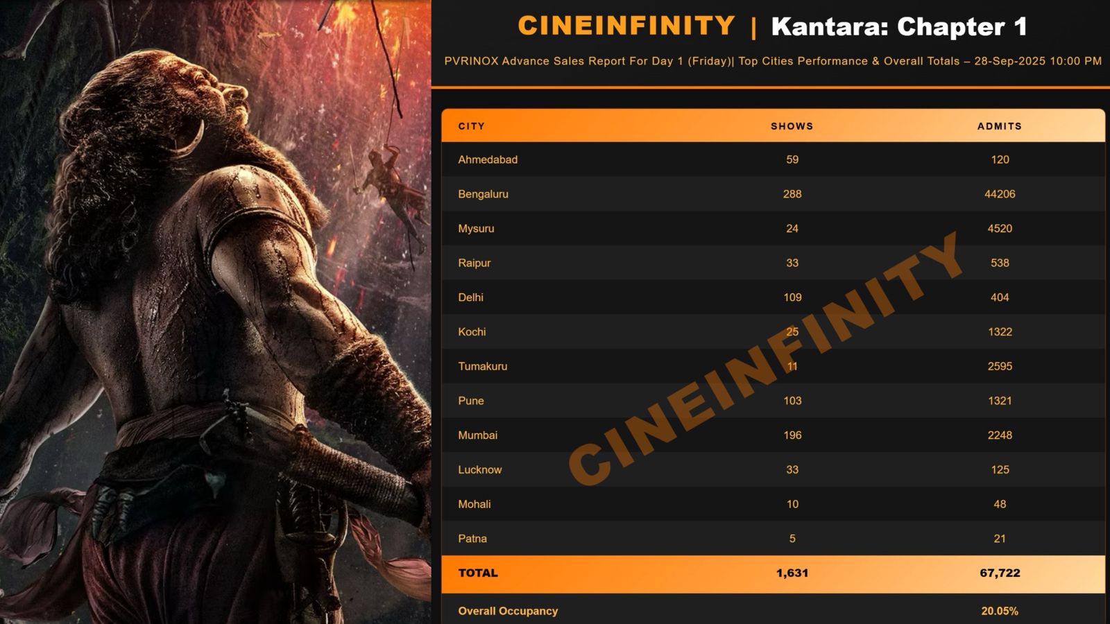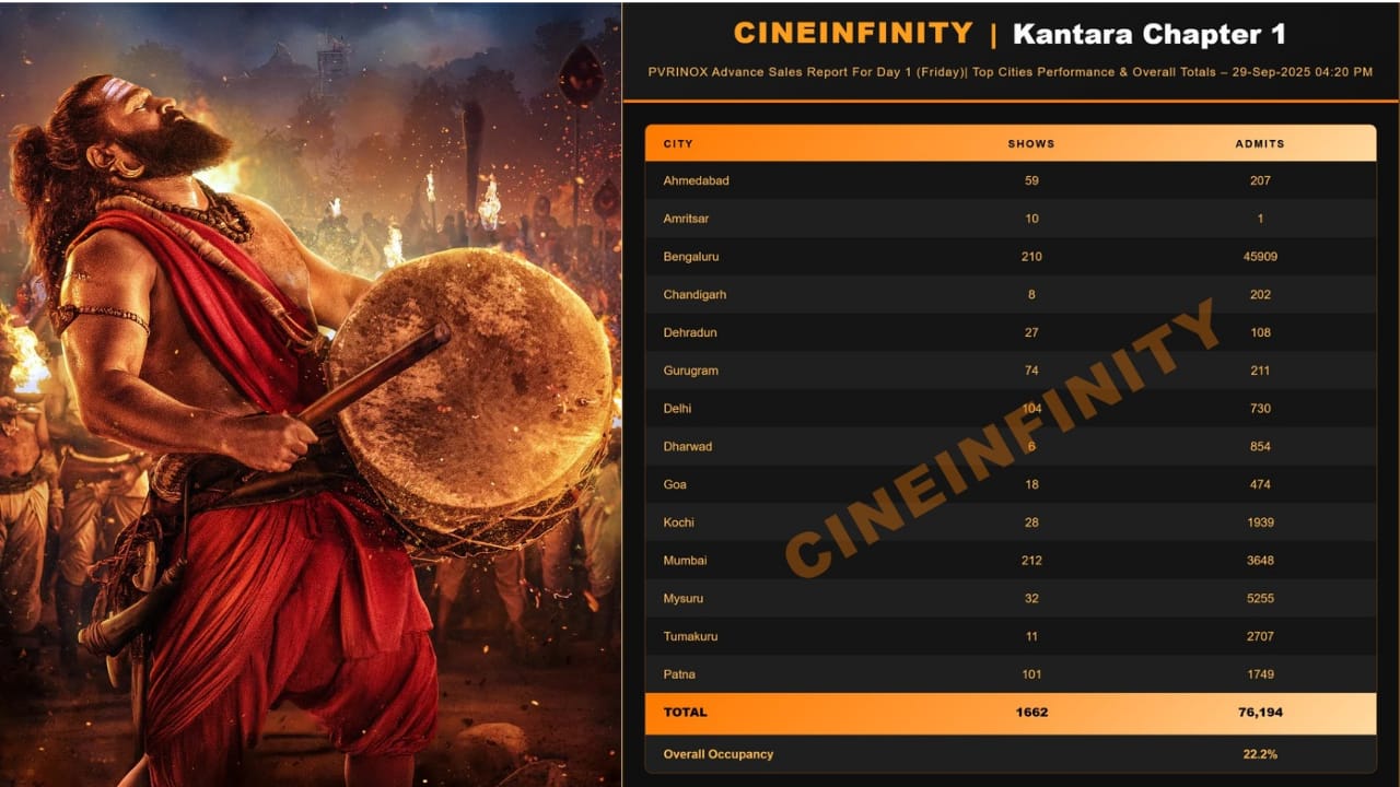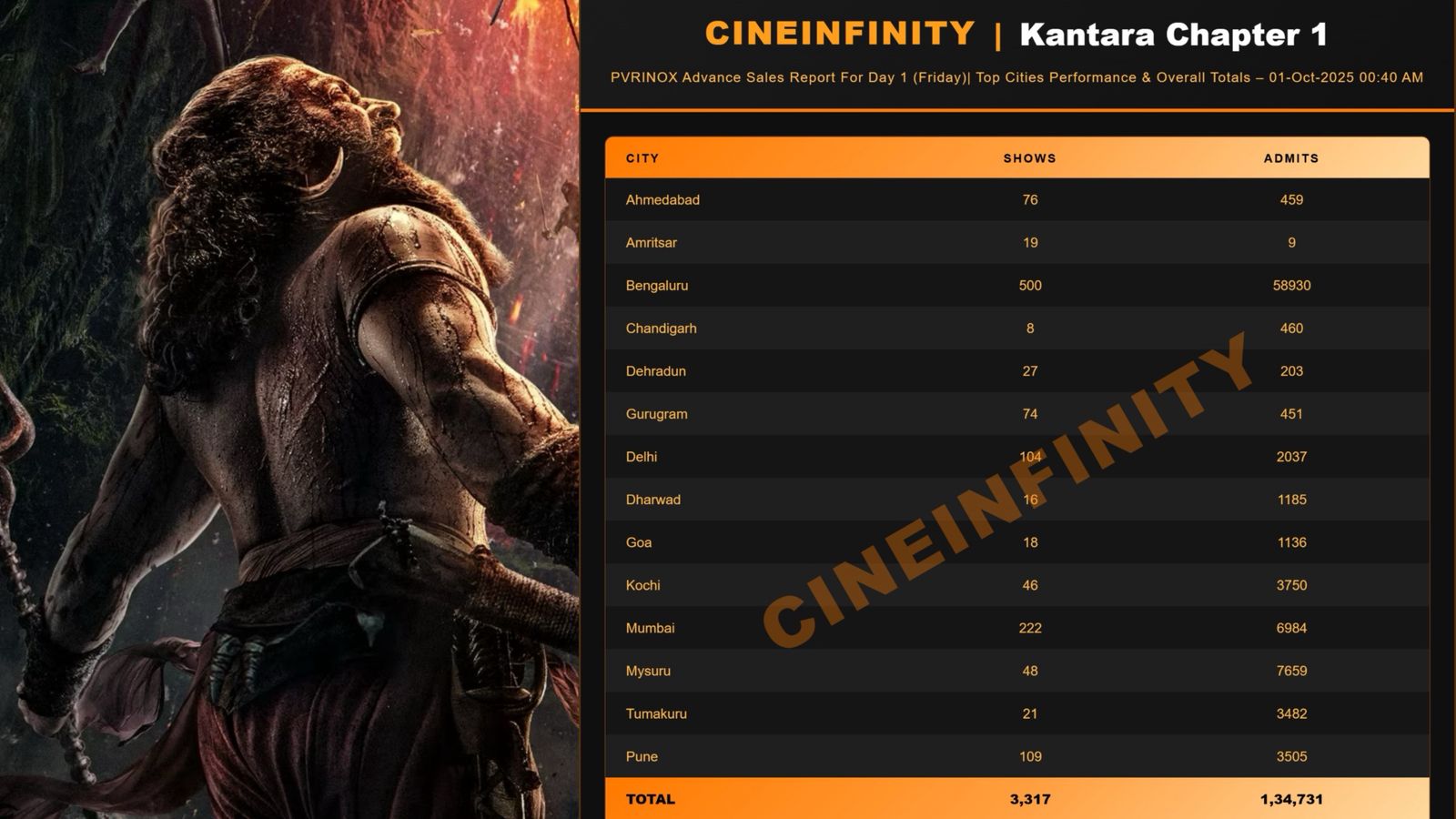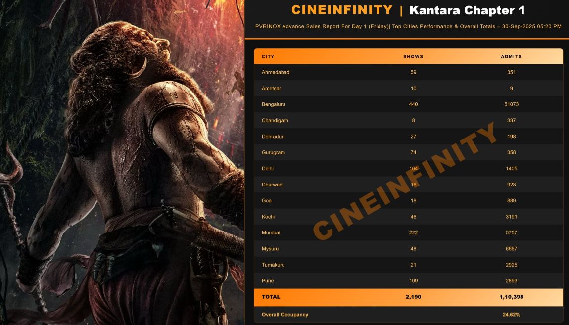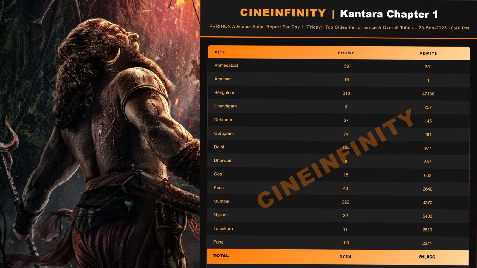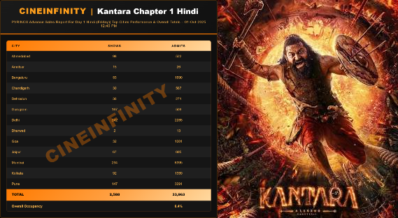 Articles Kantara: Chapter 1 Hindi Advance Booking Update (12:30 PM): 42K+ Tickets Sold in PVR-INOX-CINEPOLIS, Solid Trend Across Major Cities Admin 2025-10-01 0