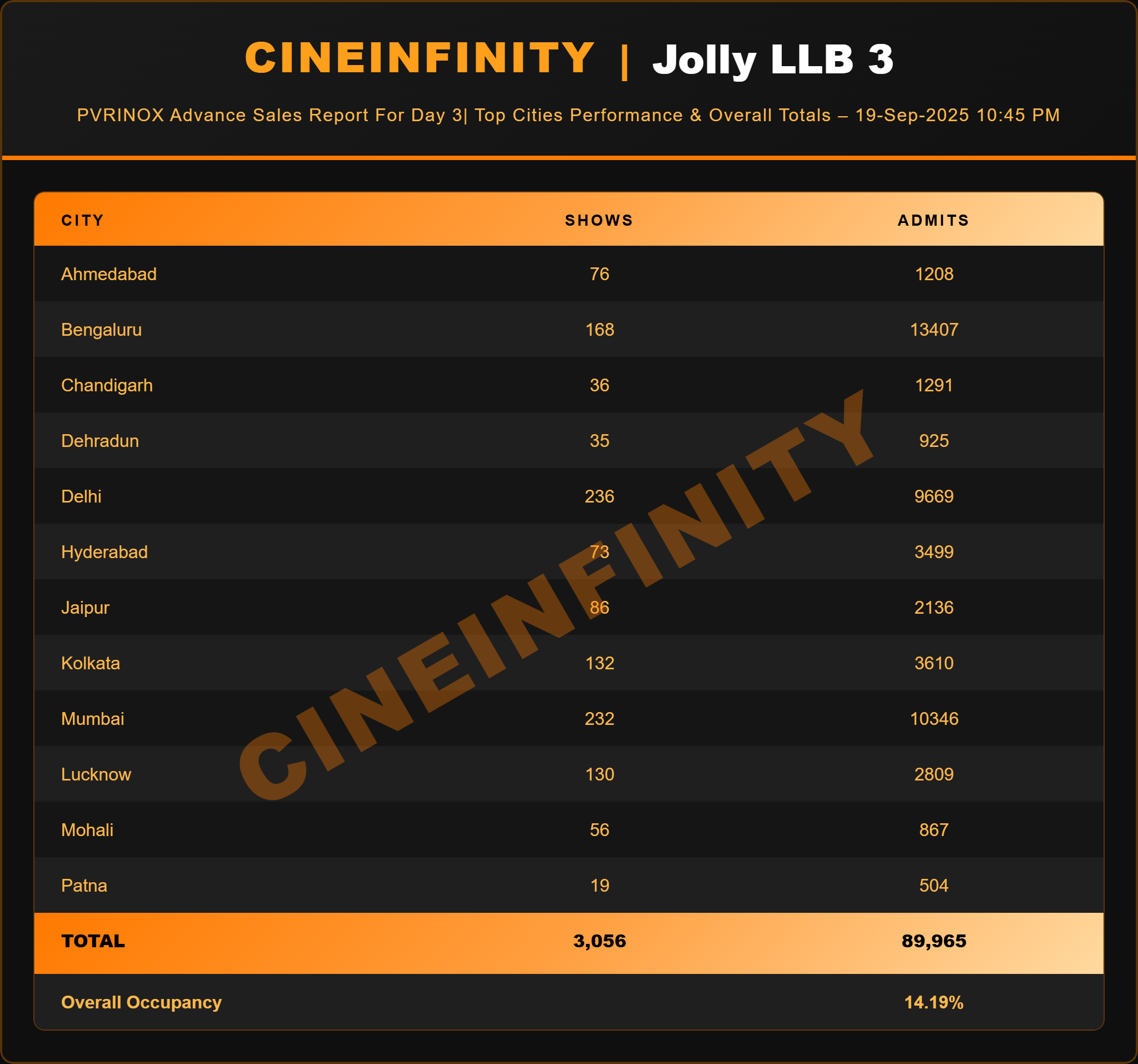 As per official PVR-INOX tracking, Jolly LLB 3 has sold 89,965 tickets across 3,056 shows for Sunday (Day 3) till 10:45 PM on September 19, with an overall occupancy of 14.19%.