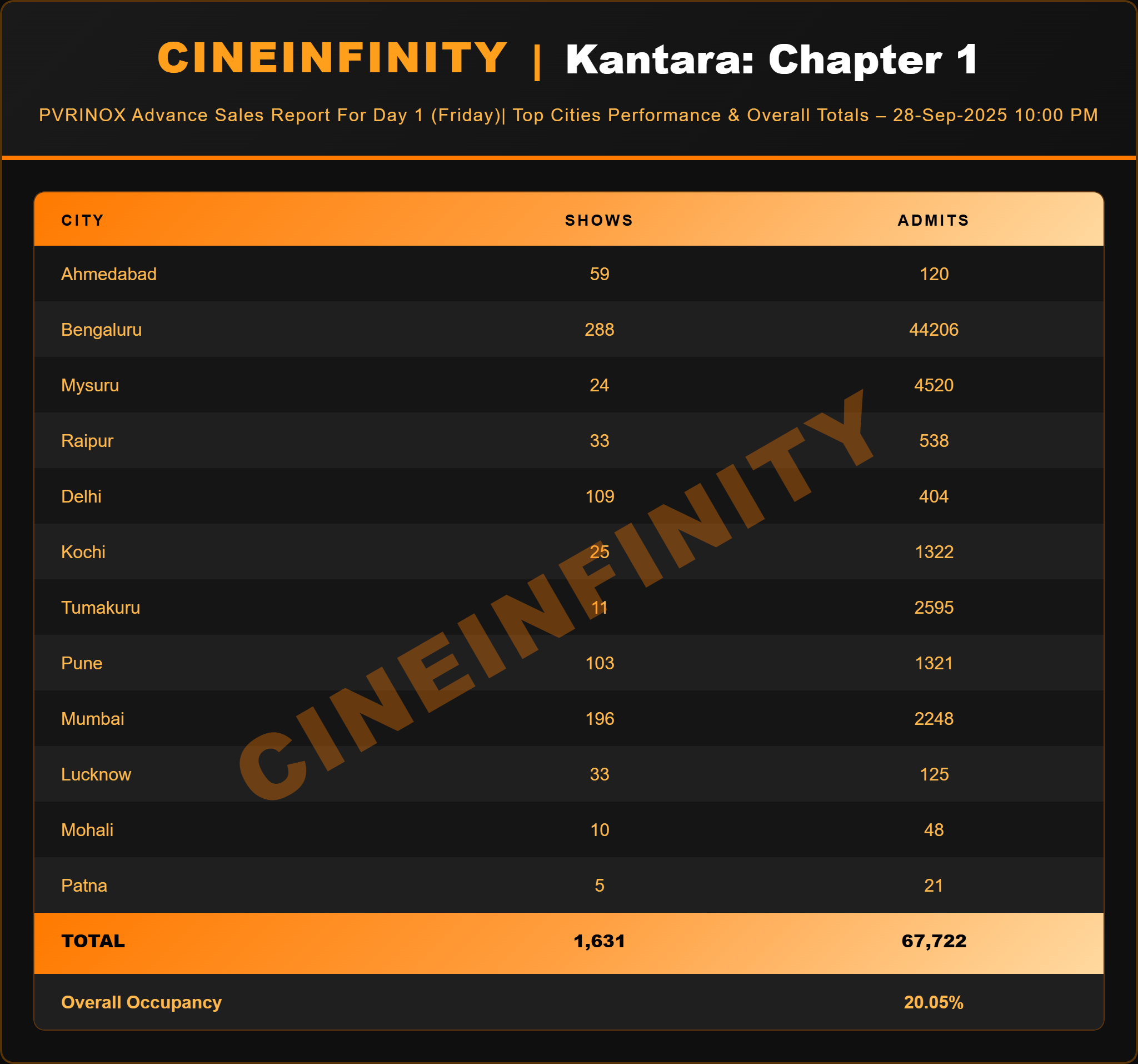 🔹 Key City Highlights (PVR-INOX, Day 1 as of 10:00 PM)