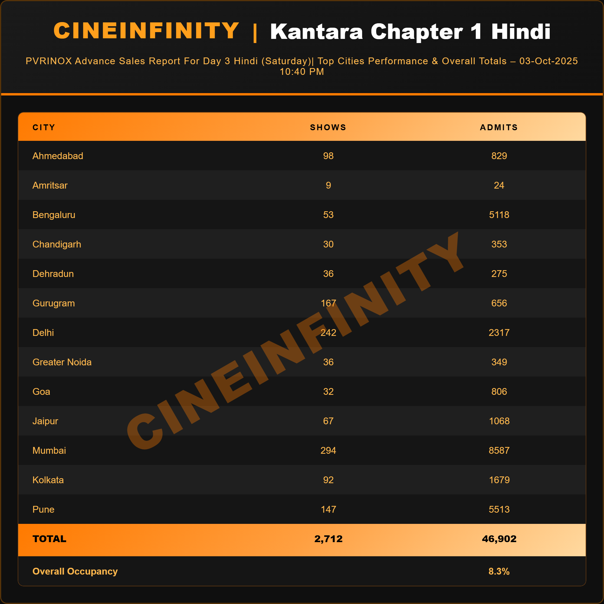📊 PVR-INOX Hindi Advance Booking Report (till 10:40 PM, Oct 3 – Day 3)