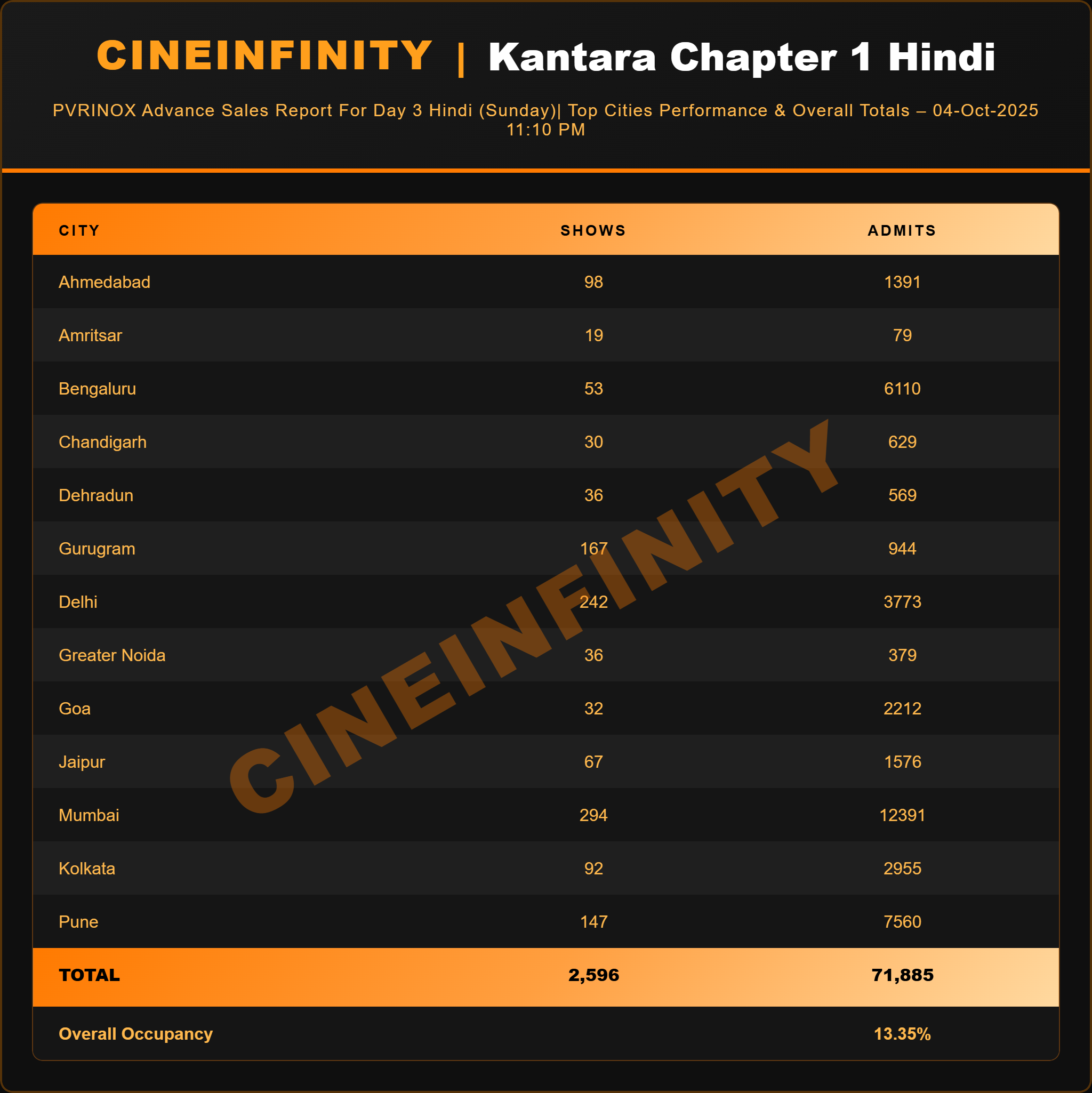 With nearly 90K tickets booked in advance, Kantara: Chapter 1 (Hindi) is showing phenomenal traction, driven by repeat audiences and glowing word of mouth. The film’s mass appeal across urban and tier-2 markets is translating into sustained occupancy across formats.
