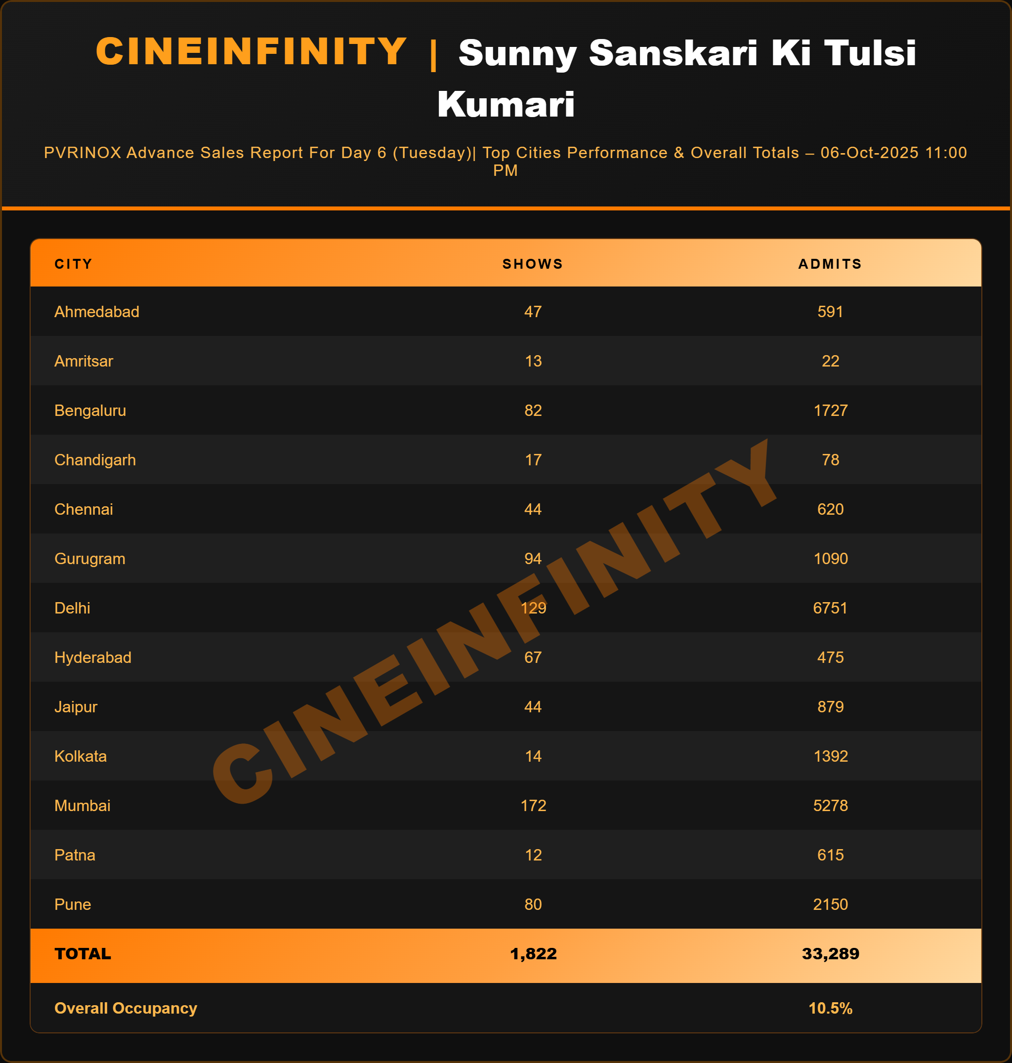 11:00 PM, the film has registered a total of 33,289 admits across 1,822 shows at PVR-INOX properties, translating to an overall occupancy of 10.5%. The spike in ticket volumes, despite reduced ticket prices, signals a solid audience turnout driven by affordability and festive spill-over curiosity.